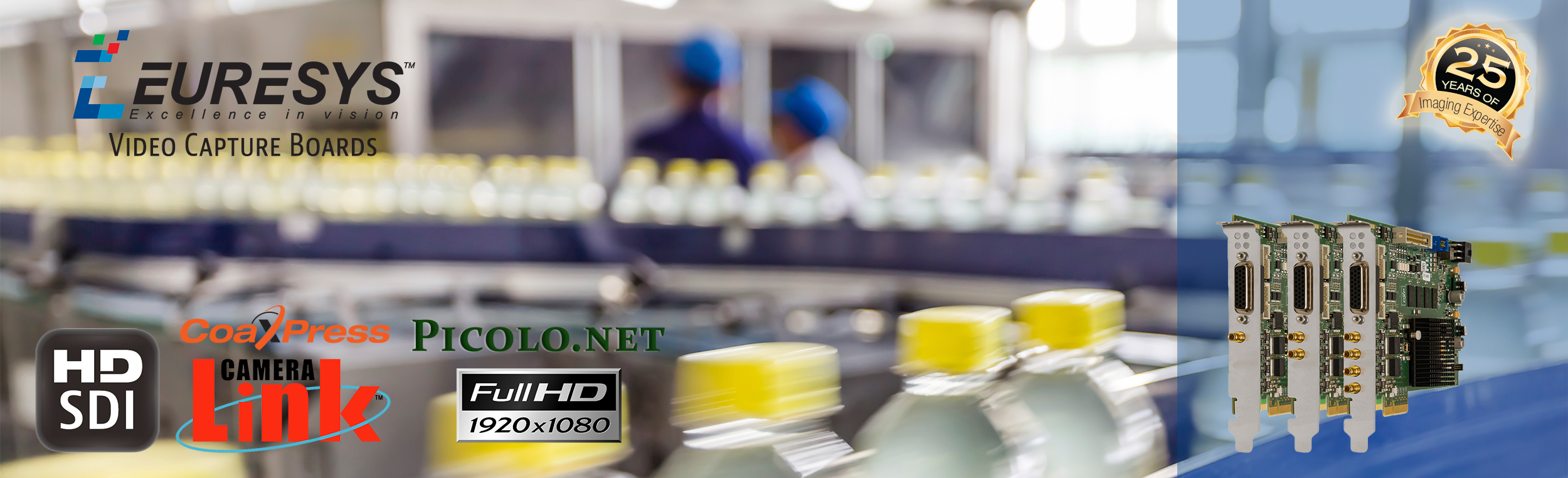 Euresys, Inc. produces cost effective vision boards (frame grabbers) and software tools for machine vision, industrial, medical, and video surveillance applications. Euresys offers the Picolo Series of frame grabbers for HD cameras, standard analog (interlaced) cameras, Coaxlink Series for CoaXPress cameras, Grablink Series for Camera Link cameras, as well as Domino Series for